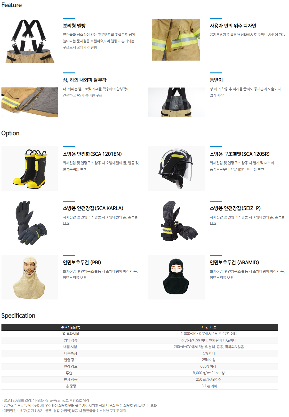 각종화재 및 재난사고에 대비하여 뛰어난 열방호성 및 방수성능 등으로 소방대원의 신체를 보호할 수 있는 상,하 및 내,외피 분리형이며 화재진압용으로 가장 적합한 PBI소재를 사용하여 다른 소재에 비해 월등히 낮은 열전도율과 높은 습도에서도 부드럽고 탁월한 건조성능을 지닌 특수피복